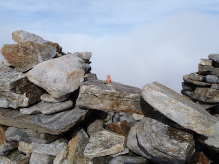 The wind was picking up and standing around wasn't an option, so we ducked down beneath the cairn, on the edge of a cornice, for some much needed shelter. The usual snaps were taken and a quick bite to eat then Jelly McBaby got in on the act...